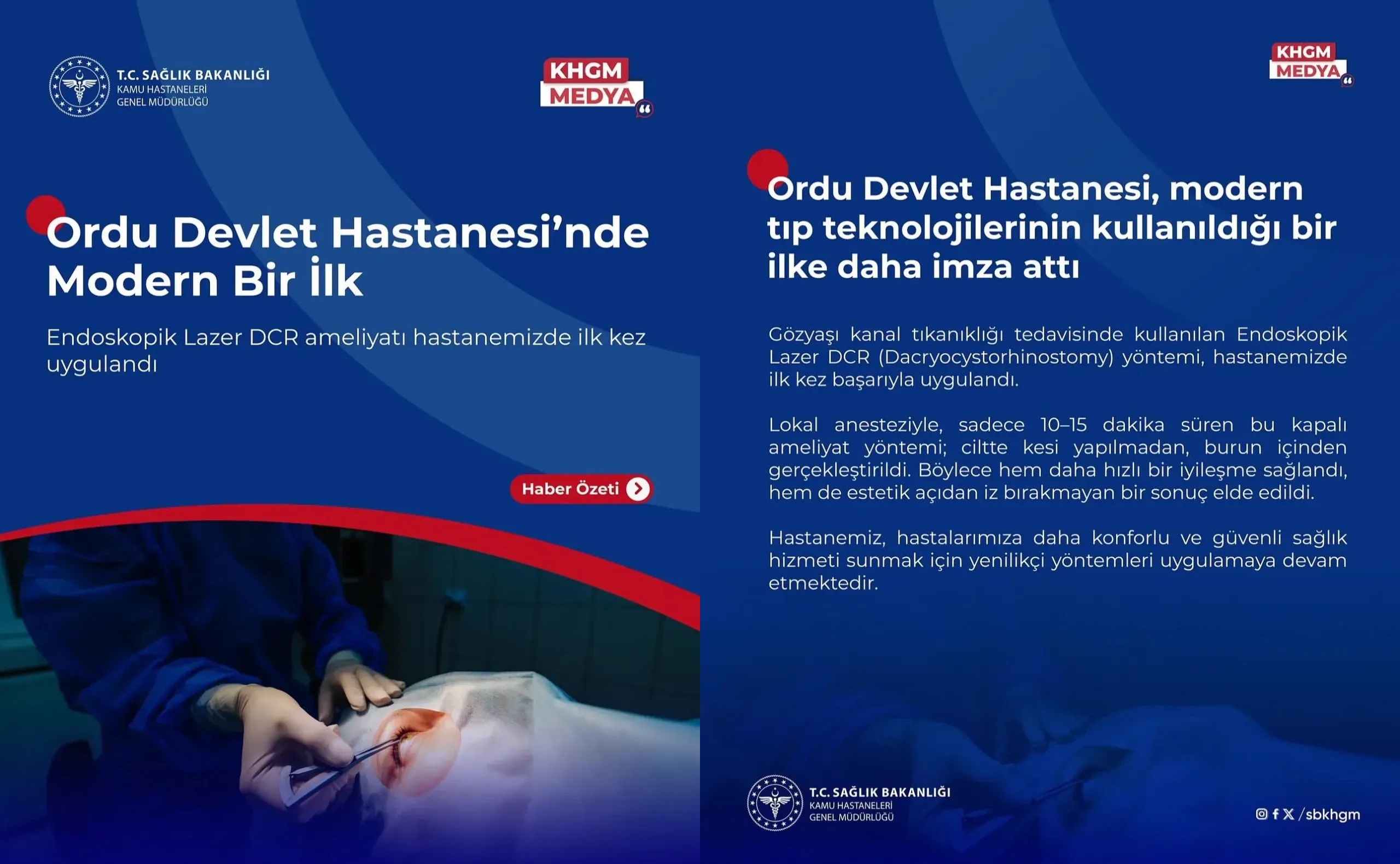 Ordu Devlet Hastanesi’nde, gözyaşı kanal tıkanıklığı tedavisinde kullanılan Endoskopik Lazer Dacryocystorhinostomy (DCR) ameliyatı ilk kez başarıyla gerçekleştirildi. Lokal anestezi altında yaklaşık 10-15 dakika süren bu kapalı cerrahi yöntem, burun içinden endoskopik olarak uygulanıyor ve ciltte kesi yapılmasını gerektirmiyor. Uygulamanın önemli avantajları arasında daha hızlı bir iyileşme süreci ve ciltte iz bırakmayan estetik bir sonuç yer alıyor. Hastalar açısından hem konforlu hem de güvenli olan bu yöntem, modern sağlık uygulamaları açısından önemli bir gelişme olarak değerlendiriliyor.